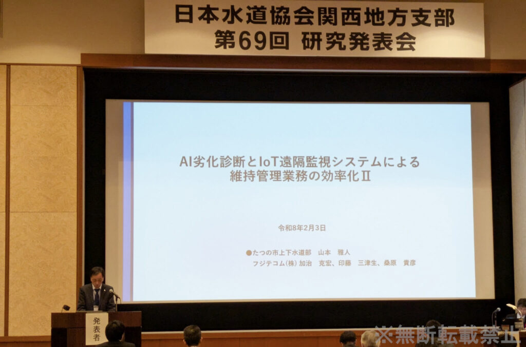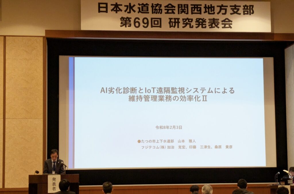 去る令和8年2月3日(火)に大阪府で開催された日本水道協会関西地方支部第69回研究発表会にて、たつの市上下水道部様との共同研究発表を行いました。